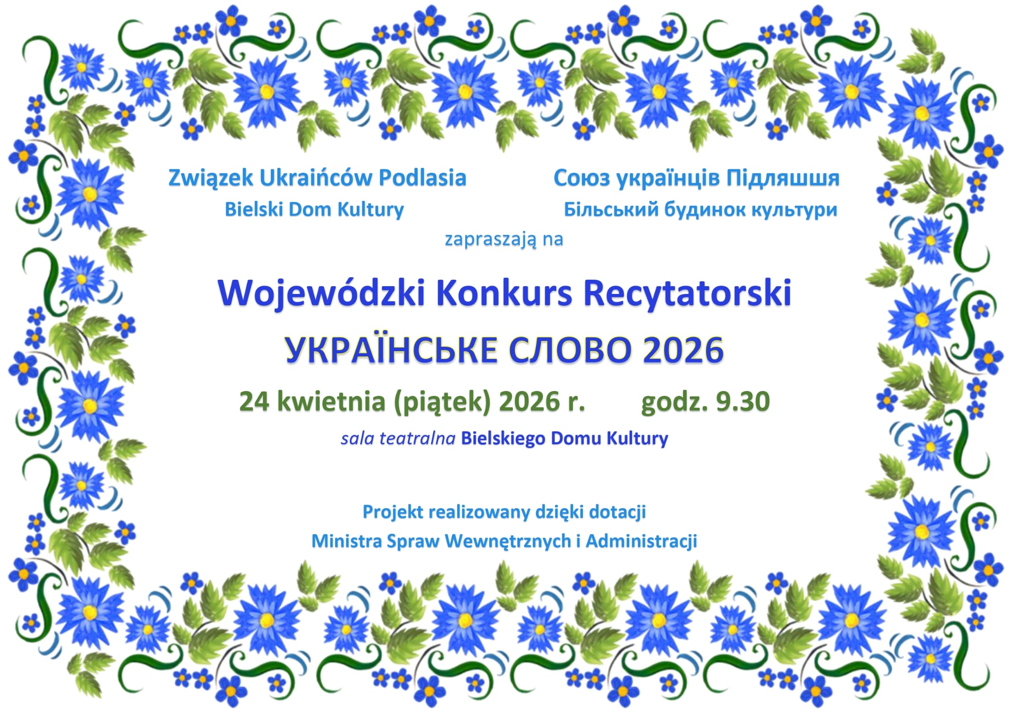 W najbliższy piątek 24 kwietnia 2026 r. w Bielskim Domu Kultury w Bielsku Podlaskim odbędą się przesłuchania konkursowe Wojewódzkiego Konkursu Recytatorskiego „Ukraińskie słowo”.