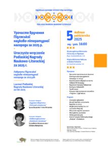 W niedzielę 5 października 2025 r. w Miejskiej Bibliotece Publicznej w Bielsku Podlaskim odbyło się uroczyste wręczenie Podlaskiej Nagrody Naukowo-Literackiej za 2025 rok. Organizatorem wydarzenia