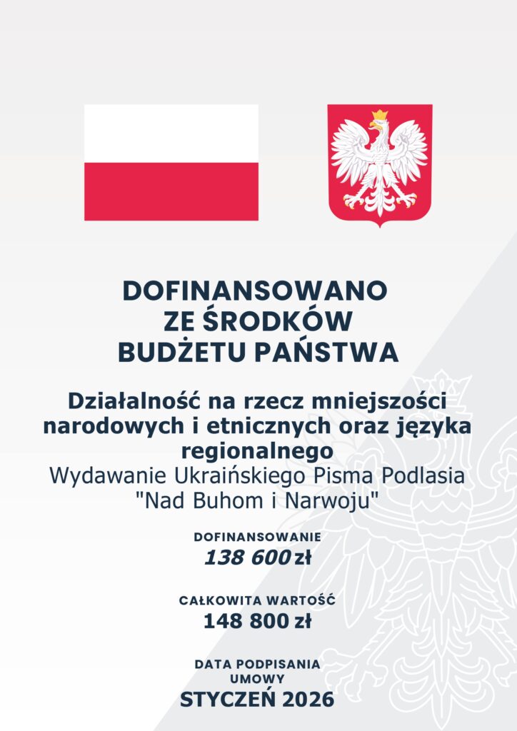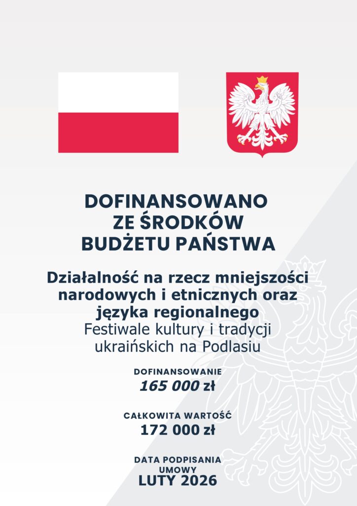 W 2026 roku Związek Ukraińców Podlasia dzięki dotacji Ministra Spraw Wewnętrznych i Administracji RP realizuje zadania: